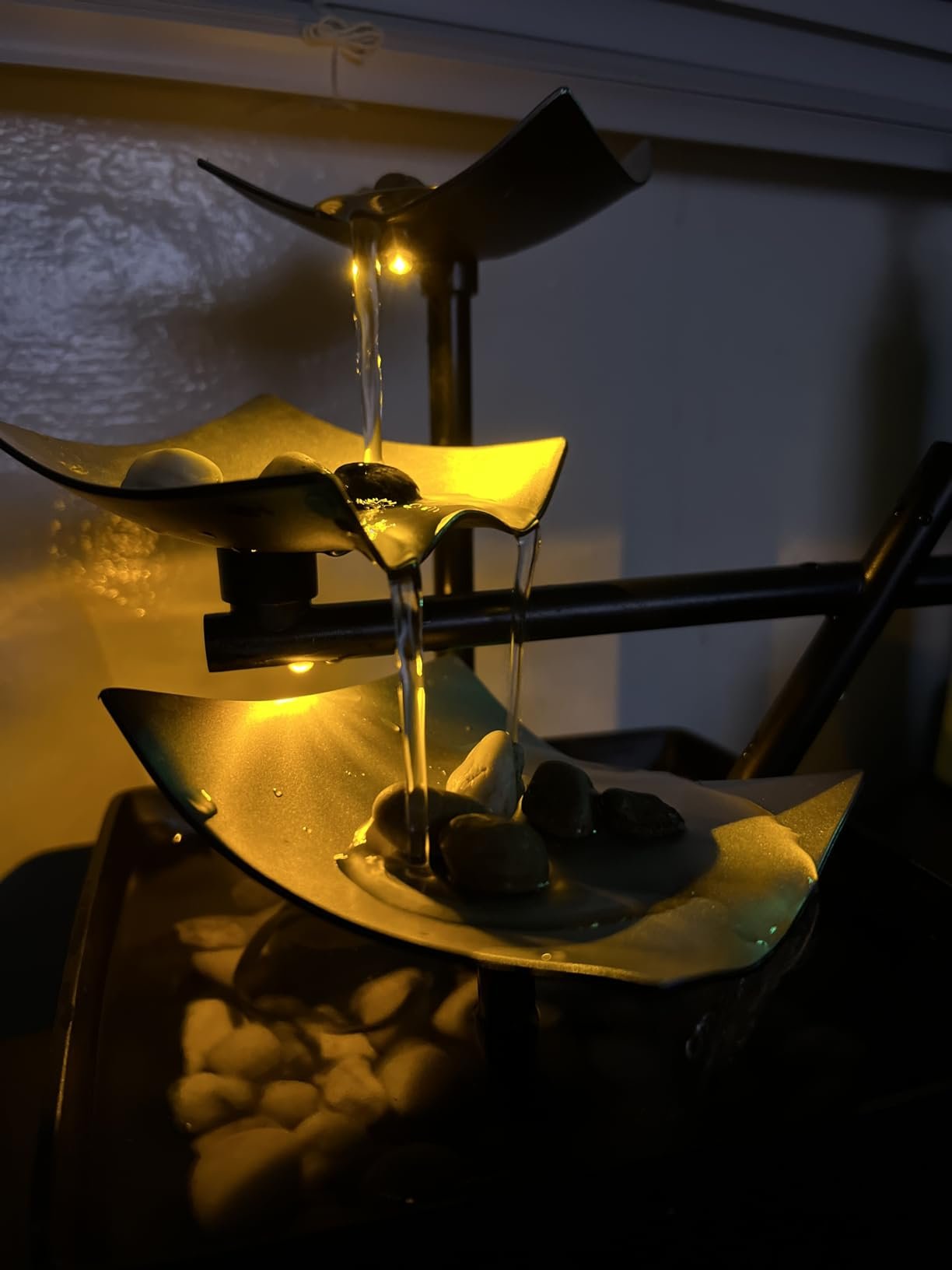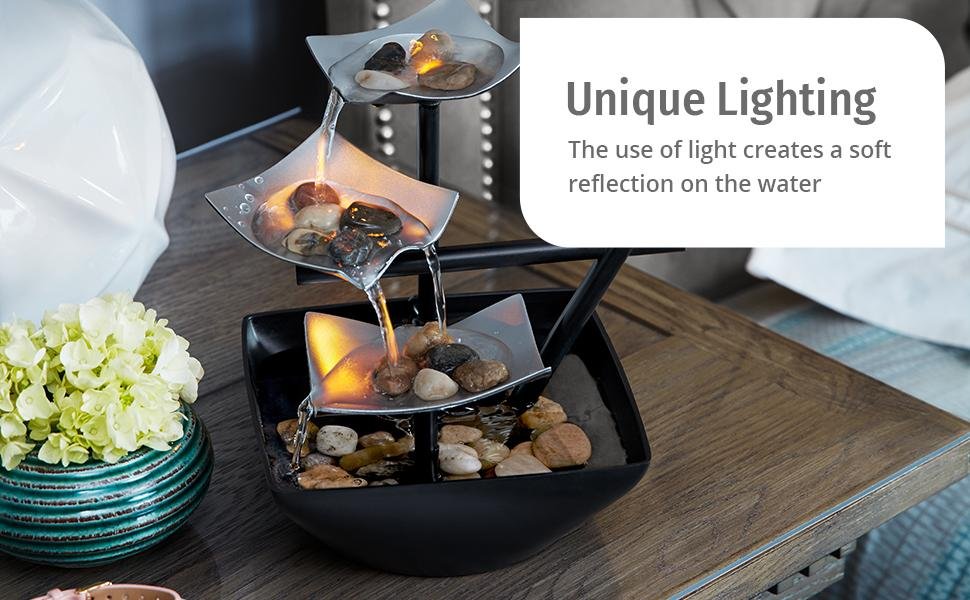 Create a peaceful ambiance in your home or office with the HoMedics Silver Springs Tabletop Relaxation Fountain. Featuring a beautiful three-tier cascading design, soft LED lighting, and natural river rocks, it delivers soothing sounds of flowing water that help relieve stress and enhance your décor. Compact and easy to use, this indoor water fountain is perfect for desks, living rooms, or meditation spaces—bringing calm and elegance to any environment.