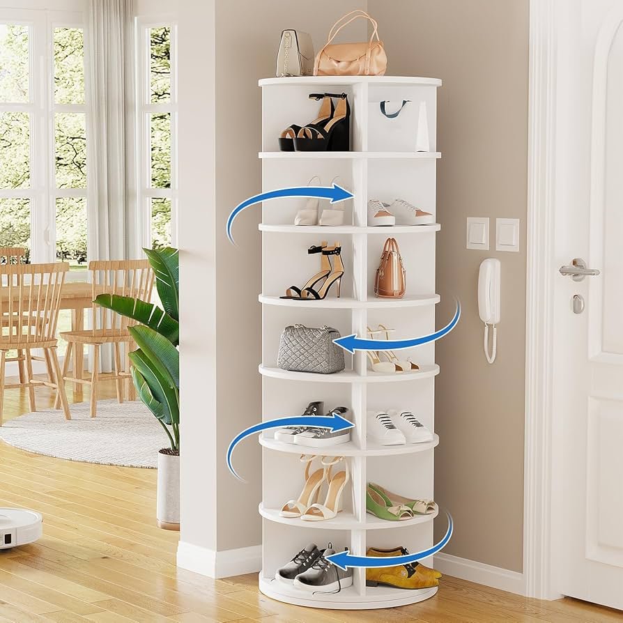 Transform your closet with the SpaceAid 7‑Tier Rotating Shoe Rack Tower. This vertical organizer features a 360° spinning design, giving you easy access to all your shoes, handbags, and accessories. With seven spacious tiers and a compact footprint, it maximizes storage in bedrooms, closets, or entryways. Made from durable materials and easy to assemble without tools, this rotating tower keeps your space neat, organized, and stylish. Perfect for anyone looking to combine functionality with convenience.